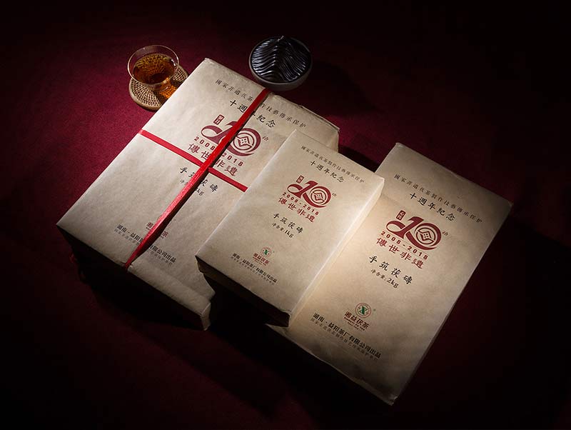 此款組合紀(jì)念茶限量收藏禮盒套裝為隆重紀(jì)念茯磚茶制作技藝列入國家非物質(zhì)文化遺產(chǎn)保護(hù)名錄十周年包含“歲月3kg”、“心傳2kg”、“領(lǐng)悟1kg”三塊精制手筑茯磚,每套均有劉杏益大師親筆簽名,并配備有獨(dú)立收藏編號的典藏證書,共10000套,收藏品飲價(jià)值皆宜。
